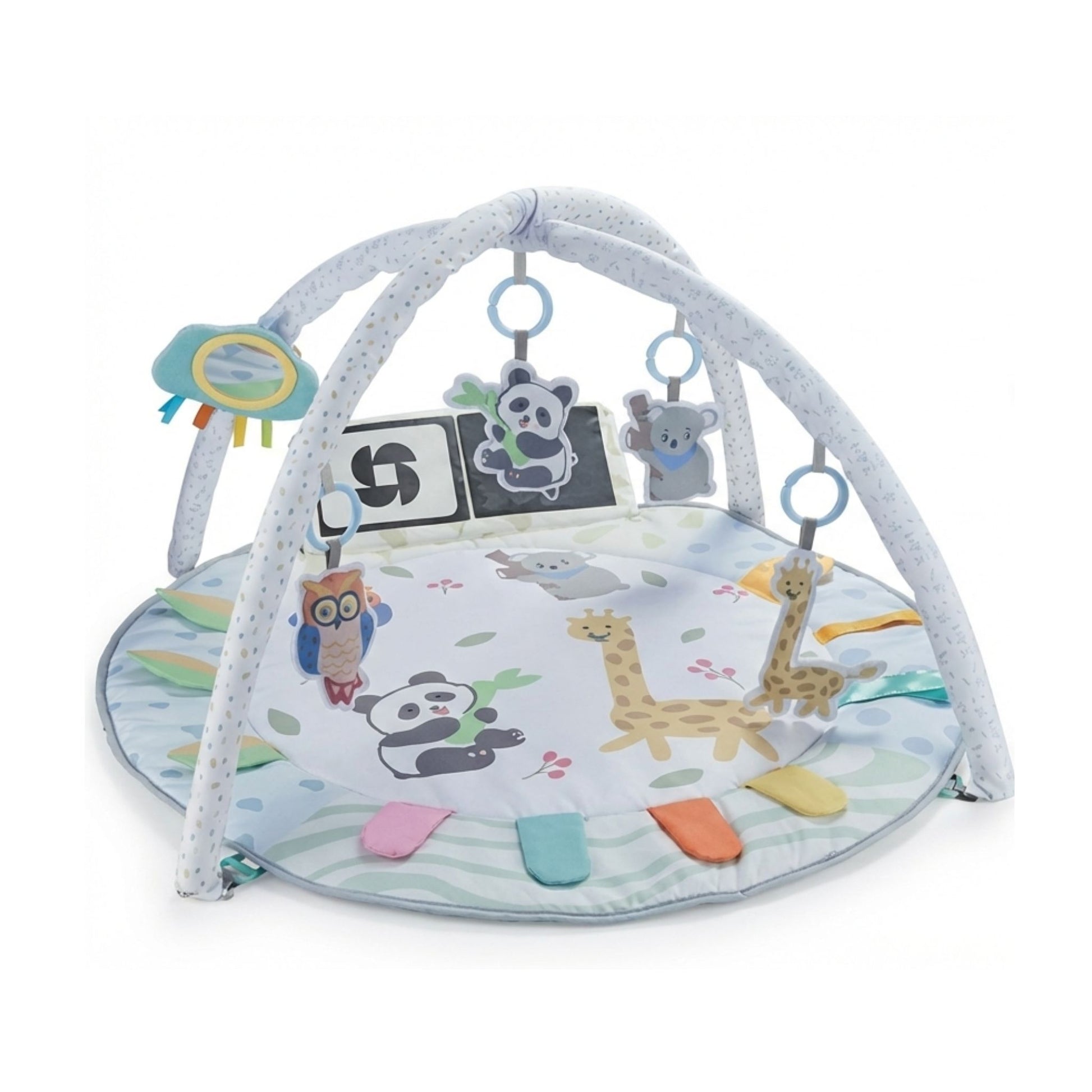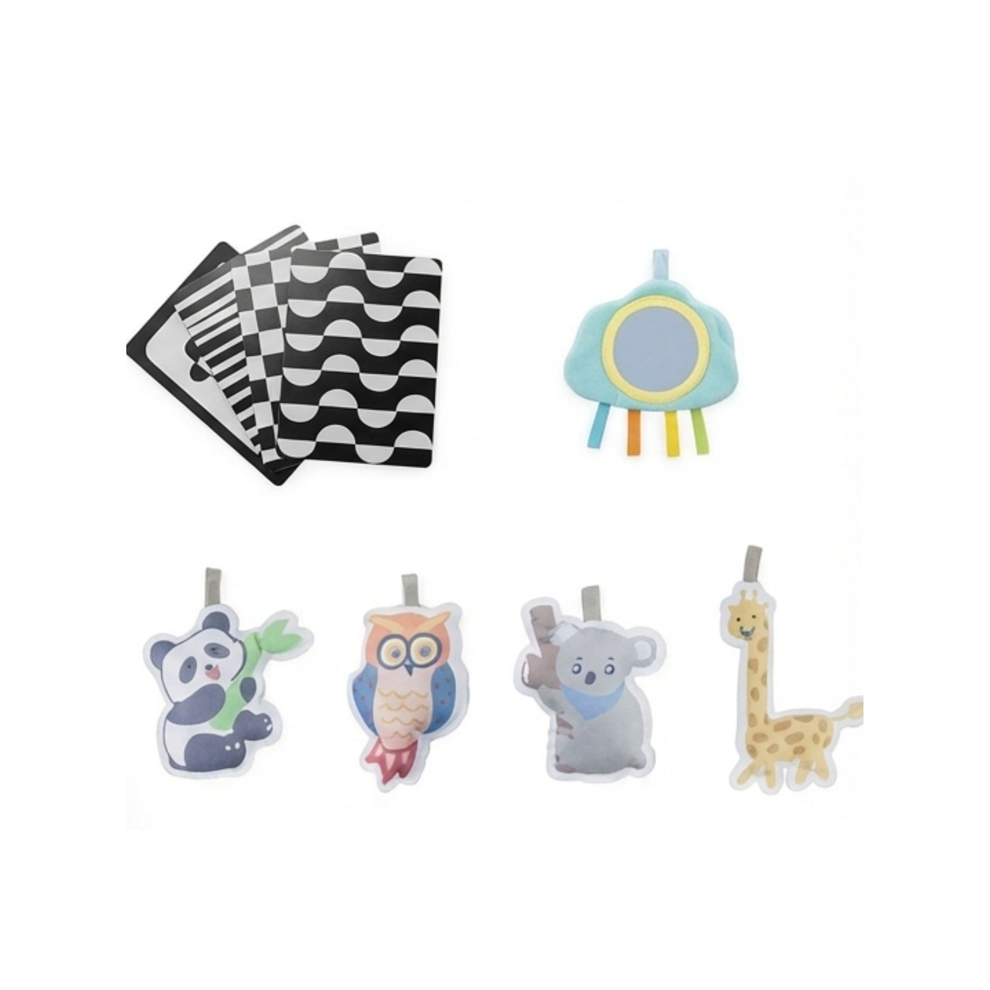 Uključuje viseće igračke, ogledalce i kontrastne kartice koje podstiču razvoj vida, dodira i koordinacije.