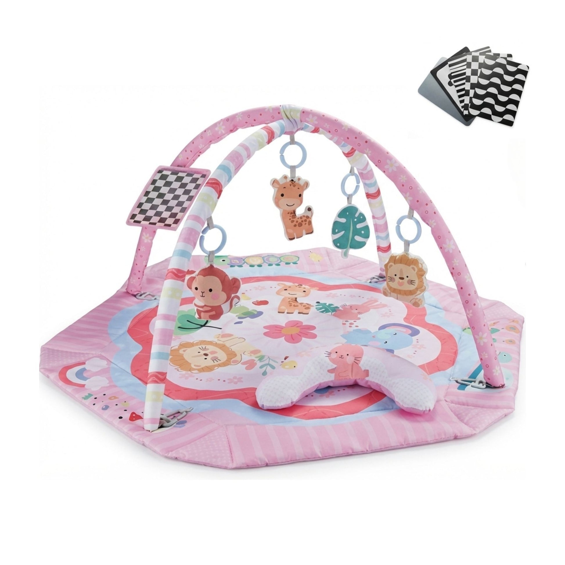 Uključuje viseće igračke, ogledalce i kontrastne kartice koje podstiču razvoj vida, dodira i koordinacije.